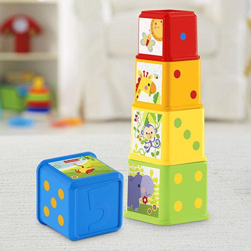 Five blocks for baby that stack up to a tower of fun, or nest one-in-one!Each 5-sided block features bright colors, interesting textures, cute characters, numbers, and familiar first objects. Baby can stack them, nest them one-inside-another, or place them side-by-side to build a colorful scene!*Features:** Five blocks to stack & nest from big to little* Numbers, colors, characters, objects and textures for baby to discover on each block* Stacking play helps baby develop fine motor skills and eye-hand coordination* Easy to stack, giving baby a feeling of self-confidence* Encourages thinking & problem solving as baby figures out how to stack & nest* Age – 6–36 months