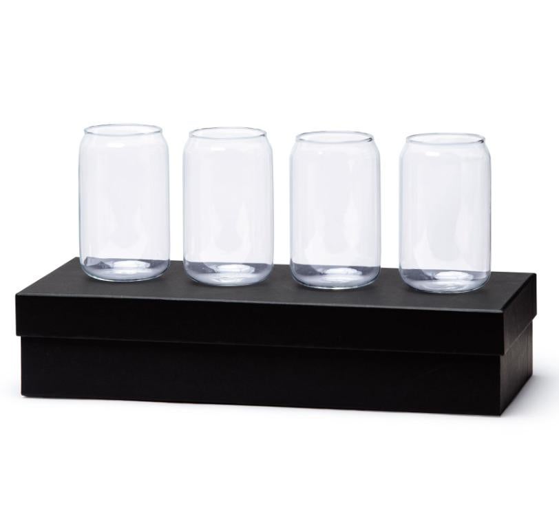 4 x Can shaped glasses perfect for cocktails and beerSupplied: in a black po ‘di fame two part presentation box (39cm W x 8.5cm H x 17cm D)* High borosilicate glass* Glasses: 12.3cm H x 6.2 cm Dia. (top)* CAPACITY: 550ml