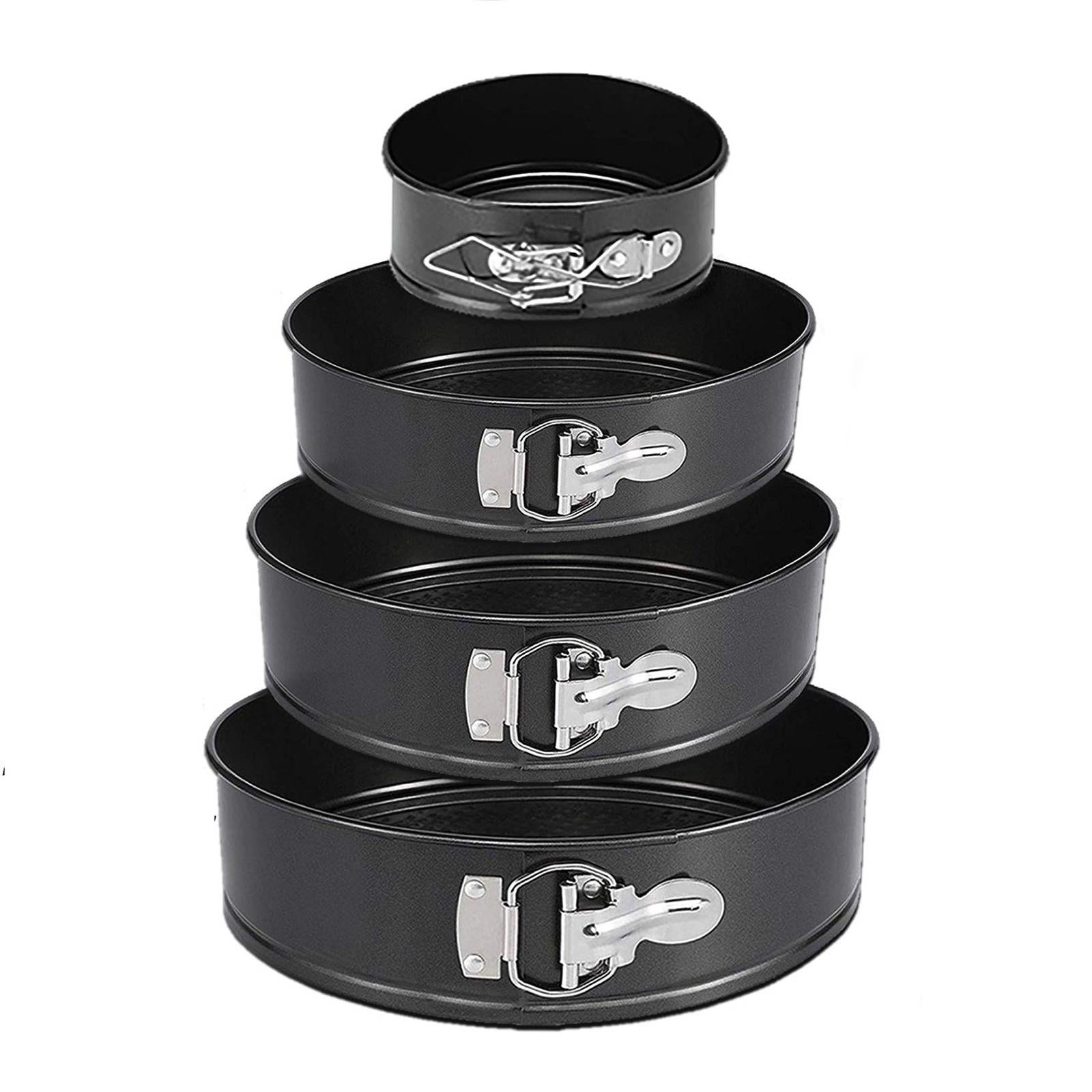 Ape Basics: Non Stick Springform Cake Pan Set 4*Features:** Extra durable non-stick coating, makes lifting out cakes and clean up a breeze!* Handy loose bottom design with an easy to release spring buckle.* 4 pan sizes for layer cakes & more.* Not Microwave safe*Specification:** Material : Carbon steel, food-grade non-stick coating* Color: Black* Warranty: 1 year*Includes:** 1 × 4 inch springform pan* 1 × 7 inch springform pan* 1 × 9 inch springform pan* 1 × 10 inch springform pan