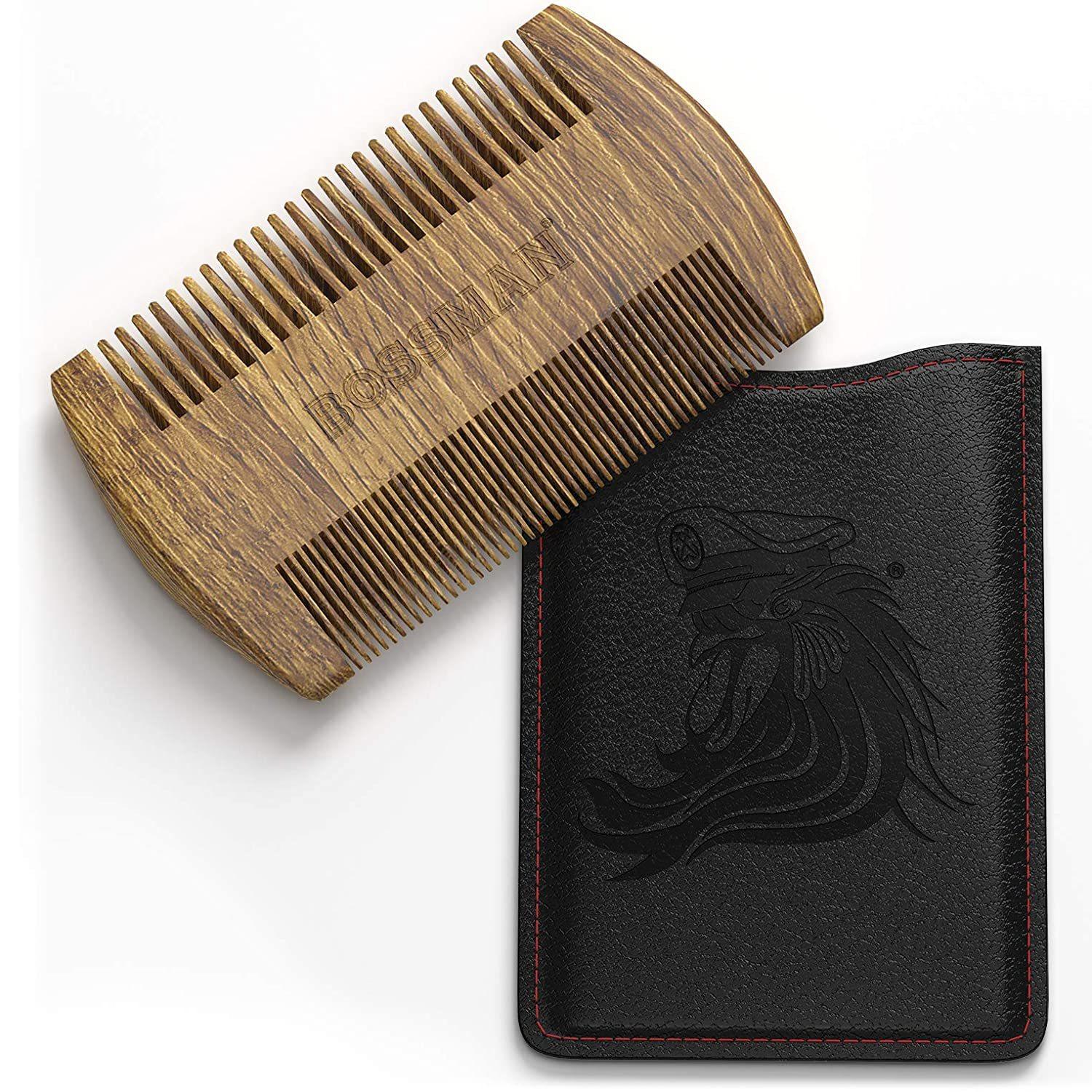 100 Percent Green Sandalwood Comb: Strength and style are vital to maintaining the Boss mentality. Our beard comb for men is made from 100 percent green sandalwood. Known for its pleasant scent, fine grain, and durability, you can trust that our wood comb will withstand daily useNo Snag Design: The sandalwood's natural oils and fine grain smooth finish mean you get a wood beard comb that powers through tangles without snagging. Start with the wide tooth side to remove large tangles and follow up with the fine tooth side for a boss like, smooth finishWooden Comb for Beards, Mustaches, and Hair: Hair coarseness ranges, and a beard, mustache, and hair comb should be able to handle it all. Our sandalwood comb features two sides: a fine tooth comb for fine hair and wide tooth comb for coarse hairPocket Comb for Travel: The perfect travel comb should easily fit into any shirt, jean, or jacket pocket without creating odd lumps that ruin your style. Measuring 4.25 × 3", its size is perfect for taking it with you wherever you goLeatherette Case with Etched Bossman Logo: We included a leatherette case to protect your beard's new on the go stylist. We designed it to protect the travel comb from the constant rigors of the day while making it easily accessible right from your pocket when your beard needs grooming