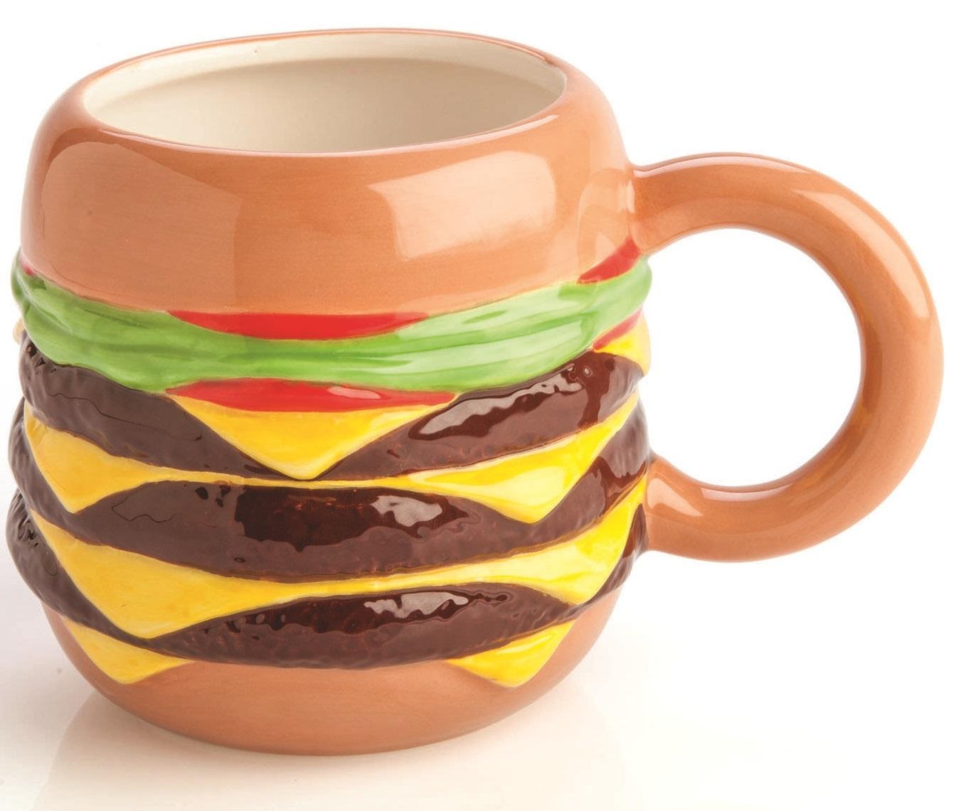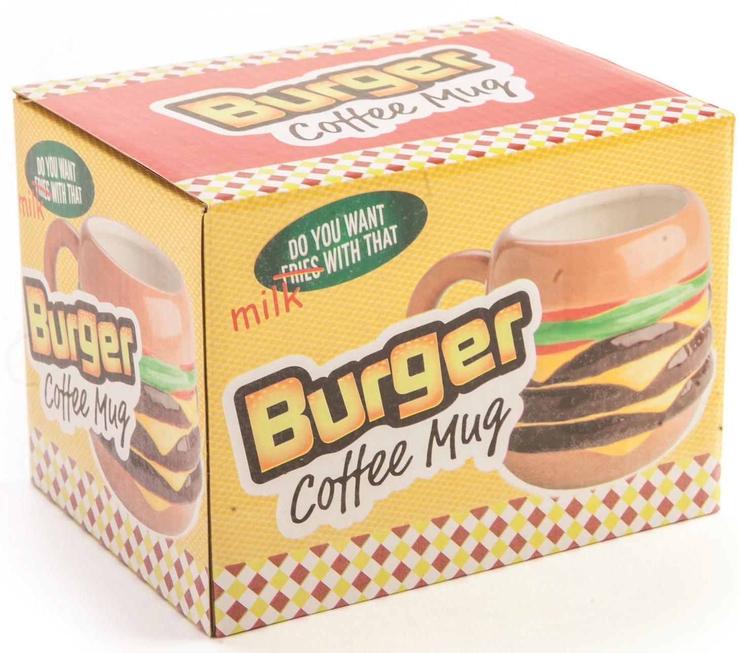 *_Burger Coffee Mug_*Show your love of juicy, meaty burgers by drinking from one too. This Triple Decker Burger-shaped Mug reveals what’s truly on your mind when you’re drinking your morning coffee: if only eating a burger for breakfast was the norm.At first glance it might just seem like a giant cartoon burger, but this brightly painted mug made from high quality ceramic will keep your hot drink steaming until the last drop.For a laugh, why not serve your guest’s drink in this Triple Decker Burger mug while asking “would you like fries with that?”*Features:** 3D ceramic burger mug* Do you want fries, I mean milk, with that?* 10(L) x 10(W) x 11(H) cm* Colour box