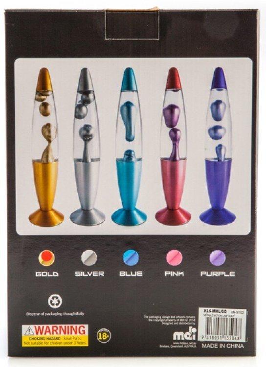 Silver base, yellow wax and blue liquid. Light warms up wax causing it to float throughout the liquid*Features:** Bottle holds 20oz of fluid* Direct to wall power* Colour box*Specifics:** *Dimensions* – 92 × 92 × 360 mm