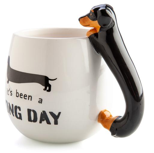 Cute mug featuring a 3D handle shaped like a black & tan dachshund! Punny quote “it’s been a long day” on both sides of the mug*Features:** Colour box* Dachshund silhouette* Hand wash only- not dishwasher safe*Specifics:** *Dimensions* – 14.5 × 10 × 13 cm