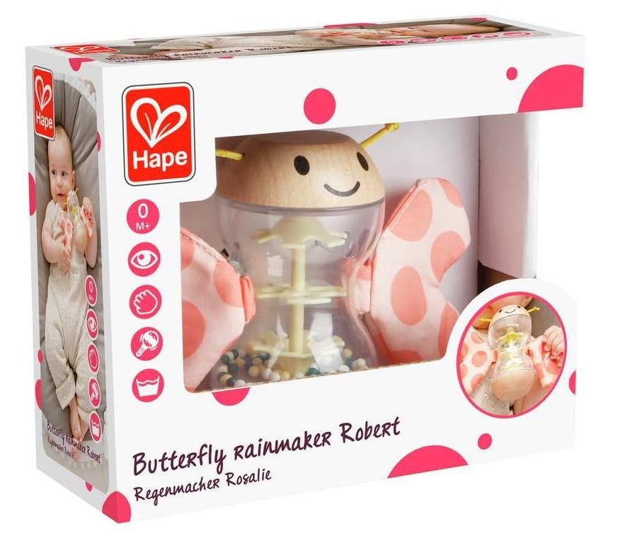 *Hape: Butterfly Rainmaker – Robert*The rainmaker Butterfly Robert offers the little ones different functions. The material mix of textile, wood and plastic invites you to grip. Dripping pearls are reminiscent of a rainmaker and crackling foil in the wings make small ears stand out. Robert can also be used as a rattle, its wings are removable and can be washed.*Features:** Stimulates baby’s senses with soothing raindrop sounds* The curved design is easy for infants to grip* Develops sensory and fine motor skills*Suitable for ages 3m & up*