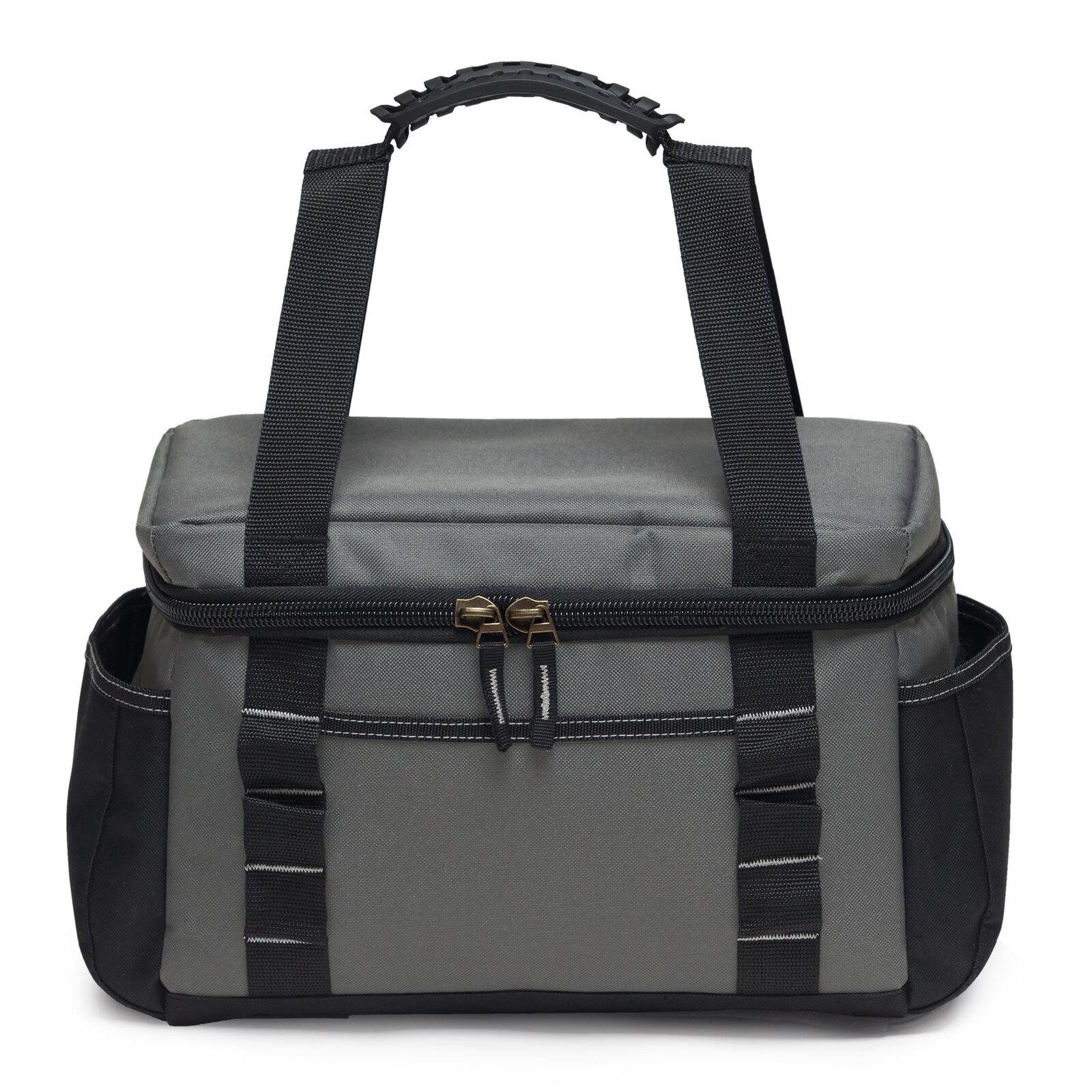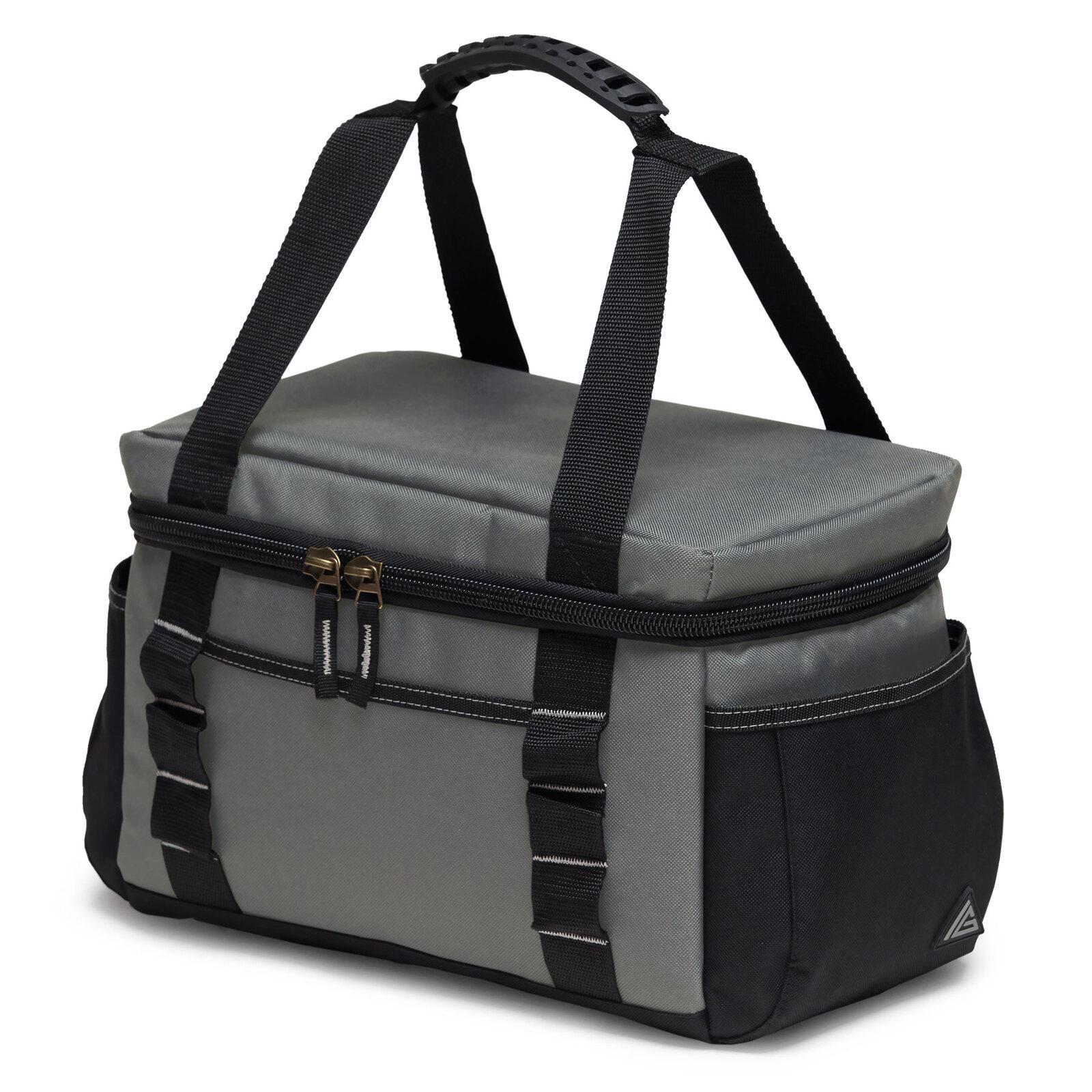 *_Ion Grit: HardHat Cooler Lunch Bag_*Keep yourself safe, and well fed with this cooler bag with a twist. Easily carry your hard hat, bottle, or anything else you might need on top while you're on the go.*Features:** Insulated zippered main cooler compartment with protective baseboard* Heat sealed leak-proof PEVA Lining* Top strap design that doubles for transporting a jacket, hard hat or a large capacity drink bottle* Moulded rubber grab handle* Antique brass zip sliders* Internal zippered mesh pocket, contains a 200ml Ice Brick / Slicker Pad* Front slip pocket* Dual end accessory slip pockets with Velcro tab closures* Daisy chain loops for attaching accessories via carabiner clip* Rubber feet for added protection* 33cm W x 23cm H x 22cm D*Hard hat and bottle are not included*