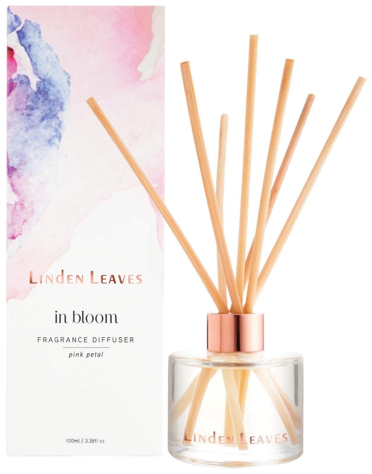 A stylish and long-lasting way to fragrance your home, Linden Leaves fragrance diffusers contain unique fragrant oil blends to offer a sense of ambience and delight to your home or office.Treat your senses to Pink Petal! A pretty, modern, fresh floral fine fragrance blend.Fragrant notes of pink petals and grapefruit layered over fresh florals. Ylang ylang and clove bud form the core. Base notes of white musk and moss.Natural diffusion through rattan reeds for a long lasting, subtle ambient scent.This is a diffuser with pedigree which will impress as a gift for friends (or just for yourself!)* 100ml_Pink Petal:A modern floral fragrance with top notes of pink petals and grapefruit layered over fresh florals, with ylang ylang, clove bud and base notes of white musk and moss._