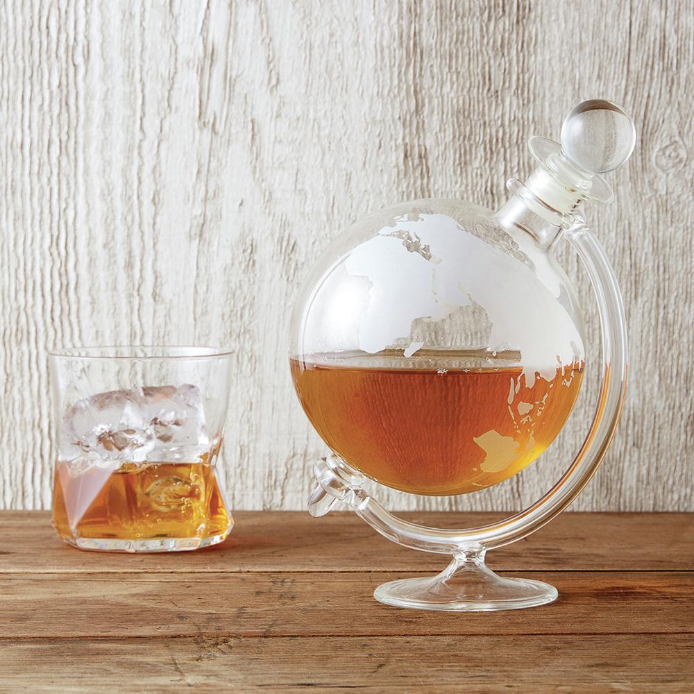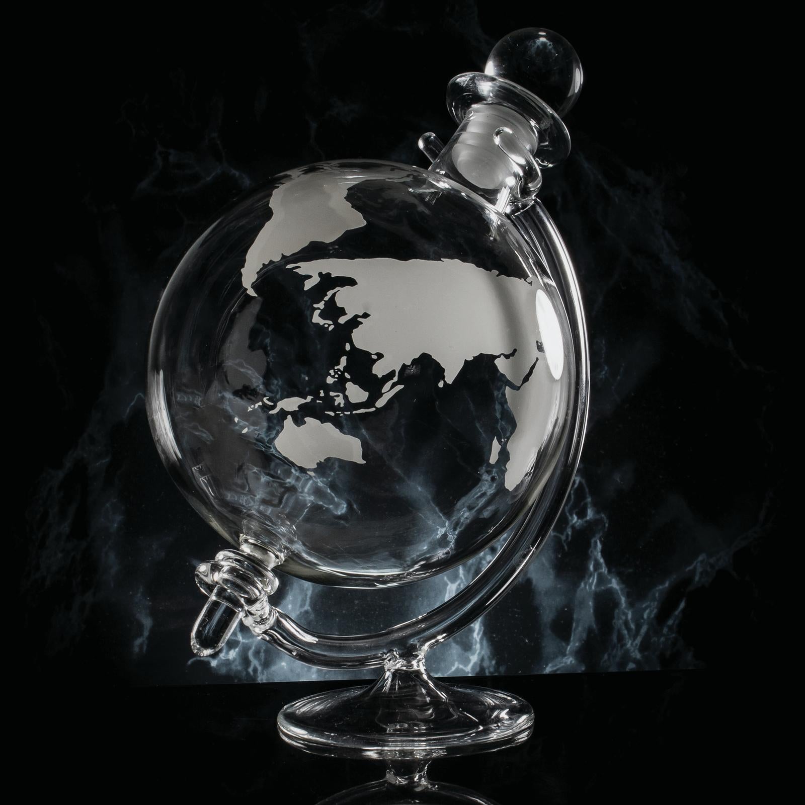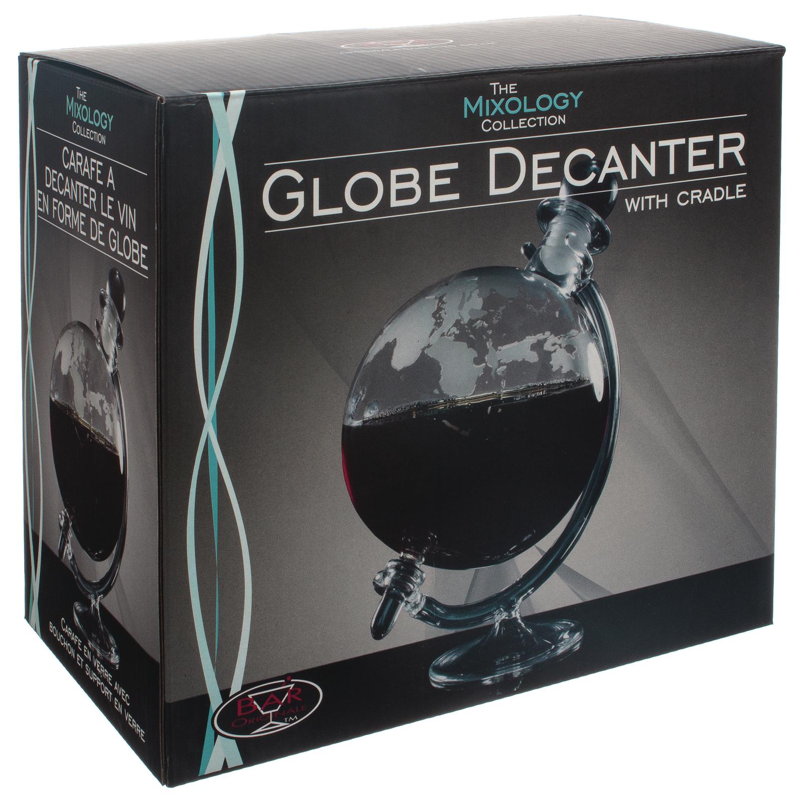 Drink the world dry using this classic glass globe decanter from yesteryear. The hand blown borosilicate globe will hold a full bottle of your favourite tipple ready to serve in style. When not in use the globe can be turned gently on its axis as it balances in the glass cradle. Then, you can hold the whole world in you hands as you pour out a drink or two. The glass ball stopper will keep any alcohol fresh with an airtight seal. Capacity 750ml. A great feature for any drawing room or lounge* Made from specialised borosilicate glass* Decanter comfortably holds a 75cl bottle of port or spirit* Not dishwasher safe.* 18cm high x 14cm deep and 14cm wide