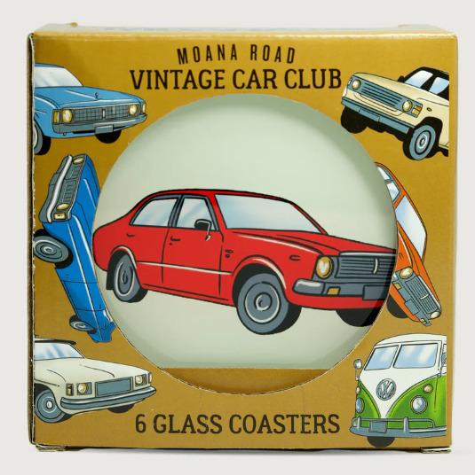 *_Moana Road: Vintage Car Club Glass Coasters_*Roll into style with these 6 glass coasters featuring six of New Zealand's favourite vintage cars!Perfect for adding a retro flavour to any dinner party, these coasters will have your guests racing for the punch bowl!*Features:** Six Coasters* Glass* Perfect gift for a car lover!*_About Moana Road:_*Moana Rd is a New Zealand brand that embodies the quintessential kiwi life, with an eclectic mix of quirky Kiwiana homewares, funky fashion accessories and choice-as technology products.We celebrate a time when baches were simple boxes surrounded by huge lawns for back yard cricket, jandals stuck to melting asphalt roads, kids rode their bikes everywhere and hokey pokey ice-creams were part of a healthy summer diet.