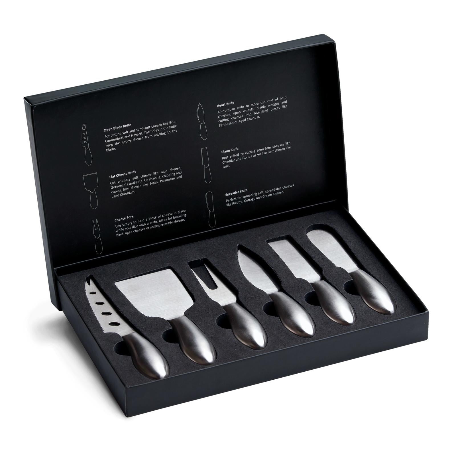 *Decoration Area:* Knives: 25mm W x 5mm H Pad/Laser*Features:** 6-pcs cheese knife set* Includes: 15cm Open blade knife, 13cm flat cheese knife, cheese fork, plane knife, 13.5cm heart knife and spreader knife* Supplied: in a black po ‘di fame two part presentation box*Specifics:** *Brand* – Po di Fame* *Material* – Stainless steel utensils* *Dimensions* – Box: 25cm W x 3cm H x 17.5cm D