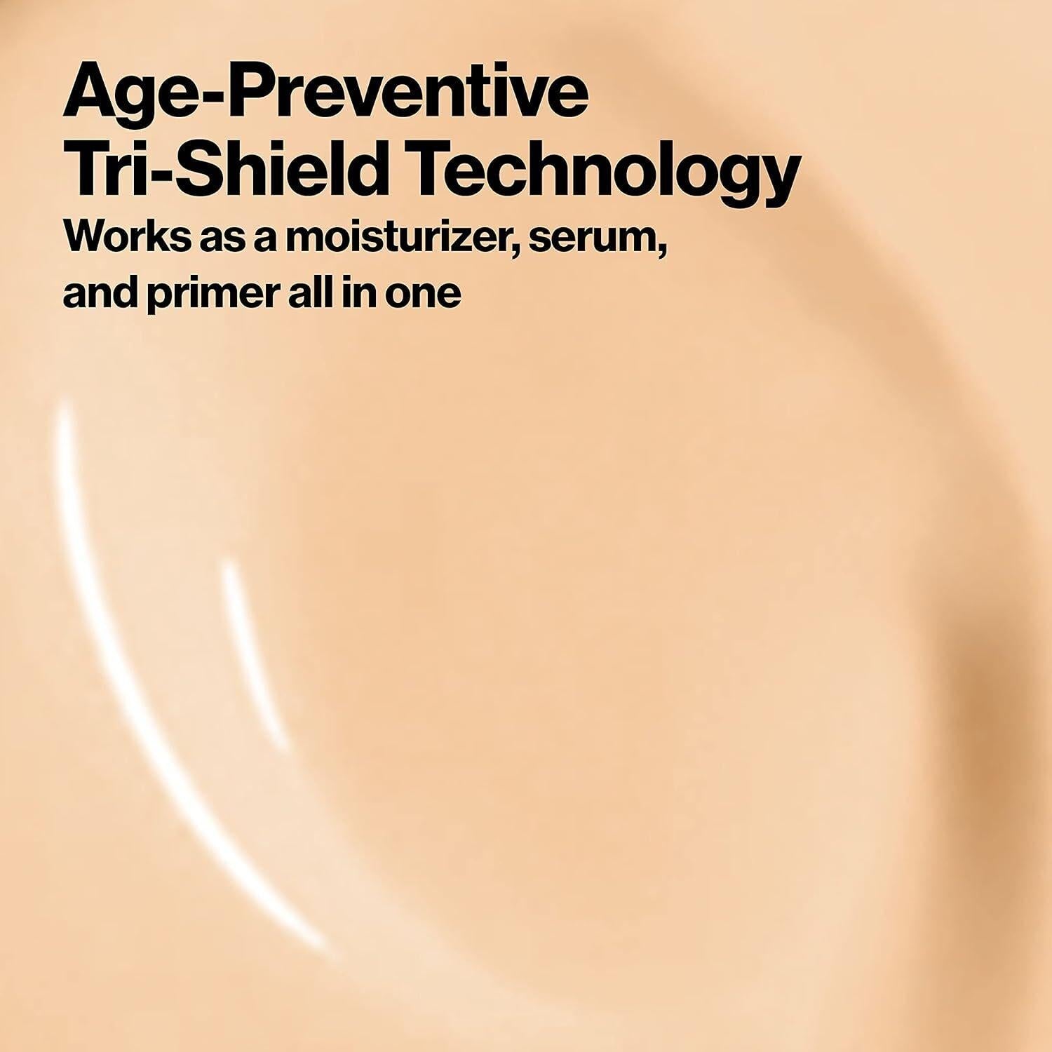 *_Revlon: Age Defying 3X Foundation – 65 True Beige_*Each exquisite shade hydrates like a moisturizer, smoothes like a serum, and preps like a primer—then SPF 20 protects. It's a one-stop anti-ager.*Features:** The ultimate anti-aging foundation: It's like moisturizer, serum, and primer—wrapped in a colorful bow!* Medium, buildable coverage with a natural finish* Keeps skin looking younger, longer, with Tri-Shield Technology—code for age-preventive benefits (including some firming action!)* With SPF 20, because you just can't protect your skin enough*How to Use:*Pump out as much as you need, dot on, then smooth over your skin with our Buffing Foundation Brush or our Dual Sided Applicator sponge, starting at the center of your face and working outward
