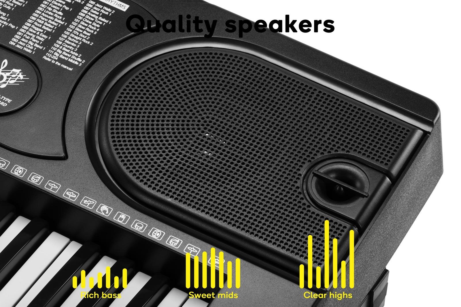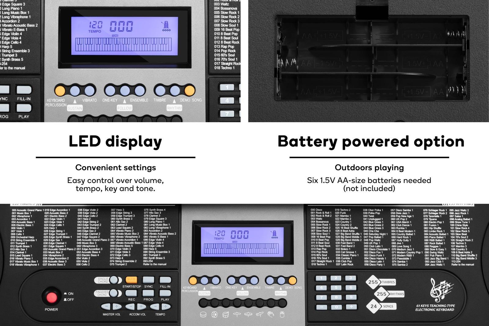 *Take music with you anywhere with this 61 key electronic piano keyboard that combines a diverse range of sounds and styles with portable convenience to help you play, record and create quality music*Discover a whole new world of music with the *Royale 61 Key Electronic Piano Keyboard & Stand* which features everything needed to get started and learn how to play like a pro.*Built-in features*This piano keyboard comes with exceptional built-in features including 24 demo tracks and 255 rhythms and timbres, with tempo, volume, key and tone control, to open up a whole range of musical possibilities.*Perfect for beginners*With three-step intelligent training and included key stickers that can be placed on the keys to assist with learning notes, this electronic piano keyboard is the perfect introduction to music for beginners wanting to learn how to play fuss-free.*Multiple inputs*Made with multiple inputs, you can easily plug in a microphone to sing and speaker outputs to play out loud, or connect your headphones for silent practice.*Perfectly portable*Battery powered and portable, this electronic piano keyboard allows you to easily take it with you anywhere.*Features:** Portable 61 key electronic keyboard* 3-Step intelligent training* Record and playback function* LCD display with volume, tempo, key and tone control* Multiple jacks including audio, microphone and phone* Includes a H stand and sheet music holder* 24 Demo tracks* 255 Rhythms* 255 Timbres*Technical Specifications*Audio* Audio Output: Yes* Input: Yes* Microphone: YesDimensions* Dimensions: 859 × 322 × 104 mm* Weight: 5.3kgPerformance* Battery: 6AAPower* AC Adapter: YesWarranty* Manufacturer Warranty: 1 Year