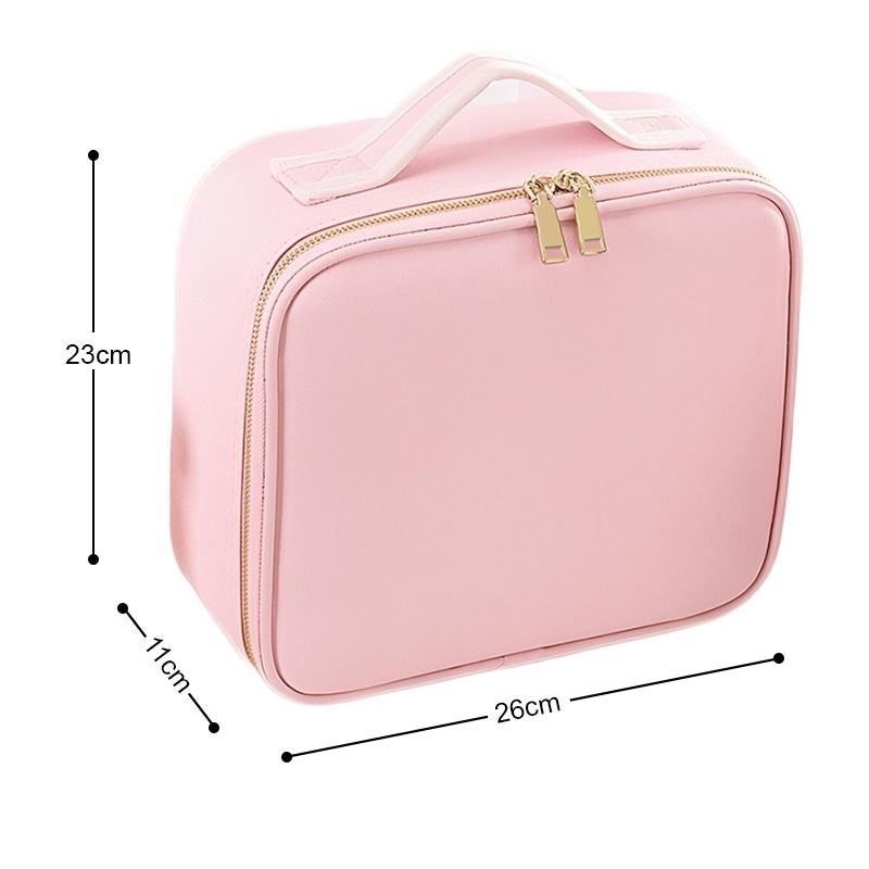 *STORFEX Travel Makeup Bag with Light Up Mirror – Pink*This versatile and spacious makeup box is designed to keep your cosmetics organized while providing convenient features for on-the-go beauty enthusiasts.*Durable and Stylish:*Crafted with sturdy and durable PU material, this cosmetic case is designed for long-lasting performance. The fine faux leather finish, ergonomic handles, and metal hinges ensure it remains stylish.*Customizable Storage:*The large-capacity design includes a removable partition and a dedicated makeup brush storage board with compartments. Customize the interior to accommodate various cosmetics and makeup brush specifications.*Full-Screen Light Mirror:*Equipped with a full-screen light mirror, this makeup box offers adjustable brightness with three light modes: cold light, natural light, and warm light. Long press the switch to adjust the light intensity from 0% to 100%, enabling you to perfect your makeup with ease.*Technical Specifications*Colour: PinkMaterial: PU Leather, PolyesterDimensions: 26 × 11 × 23 cmWeight: 1.3 kgRated Input: DC 5VCharging Time: 3 hoursUsage Time: 3–5 hoursBattery Information: 2000 mAhPackage Contents:1 x STORFEX Travel Makeup Bag with Light Up Mirror1 x Brush Storage Pad1 x User Manual