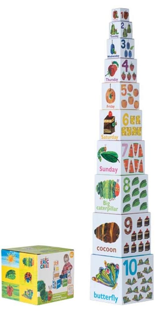 *_The Very Hungry Caterpillar: Stackable Learning Blocks_*This set of 10 building blocks from The World Of Eric Carle offers hours of fun and learning! Constructed from coated paperboard and with a nesting capacity for easy storage, these beautifully illustrated blocks feature lots of instantly recognisable characters and objects from the iconic storybooks, including the Very Hungry Caterpillar and friends.A great developmental and educational tool for your little one, these building blocks aid in the recognition of numbers, alphabet letters, colours, characters, shapes and sizes.*Features:** Assists with the development of motor and problem solving skills as well as recognition of numbers, alphabet letters, colours, characters, shapes and sizes* Made from coated paperboard which easily wipes clean* Blocks nest inside each other for easy storage, and are presented in a branded gift box* Suitable for 6 months+
