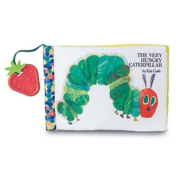 This fabric book has tactile features including crinkly pages, press squeaker, mirror and strawberry shaped teether. There are 6 pages; featuring a different item from The Very Hungry Caterpillar story book; including the sun, an apple, a piece of cake, a nice green leaf, & a beautiful butterfly. Suitable for birth and up Made from polyester fibres and cellophane. Surface washable.Size: 20 cm.Ages: Birth +