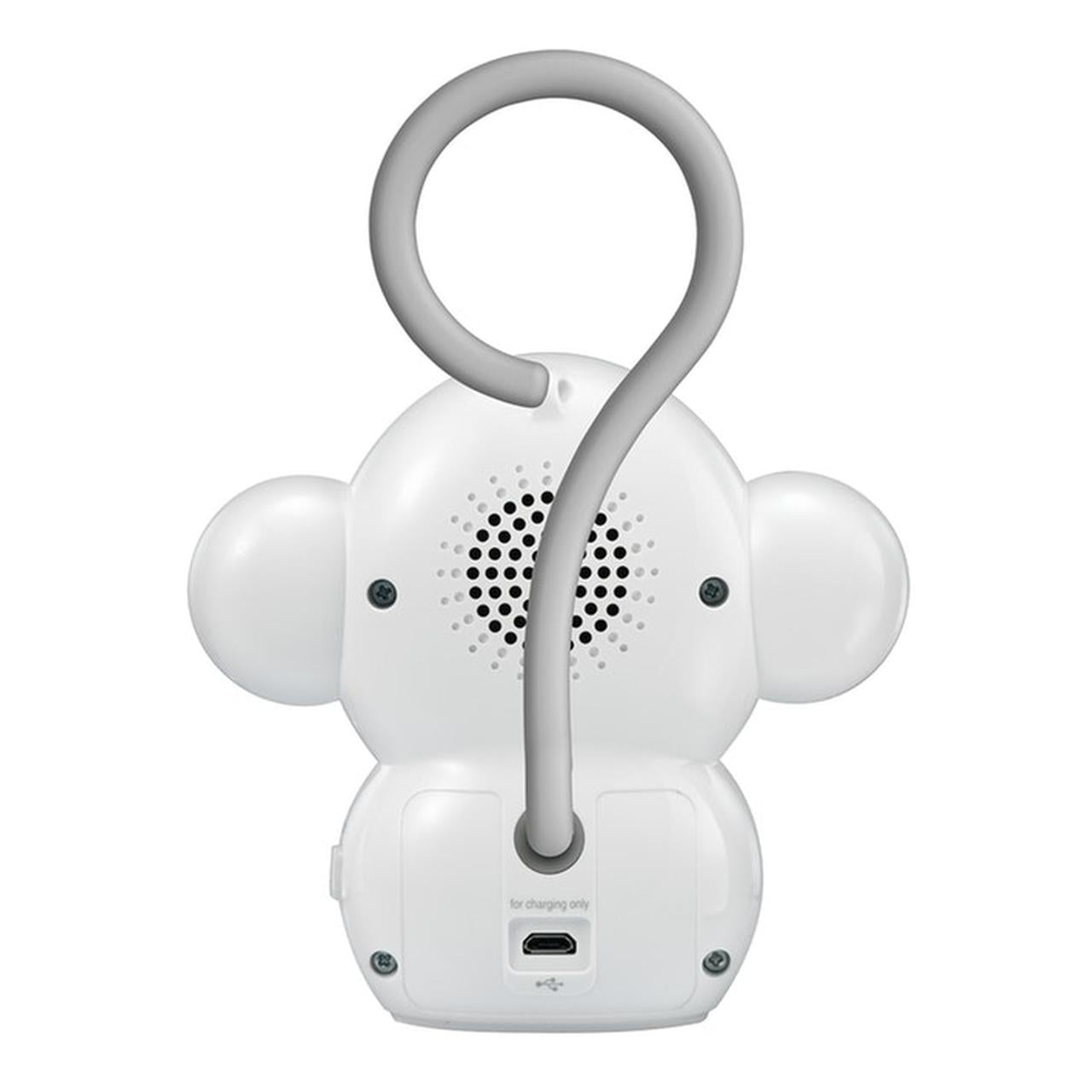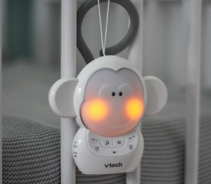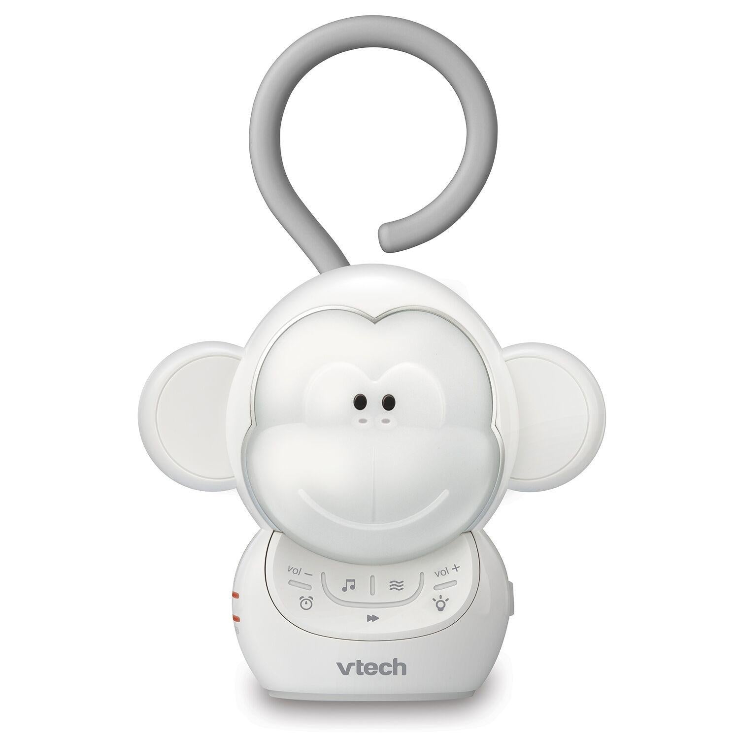 *Keep baby calm even on the go with the VTtch Safe & Sound Portable Monkey Baby Soother.*This portable soother attaches almost anywhere and lets you choose from 5 gentle lullabies and 5 soothing sounds like white noise to relax your little one while on the road.The flexible tail on this monkey-shaped noise machine hooks onto things like doorknobs, stroller handles and even car seats. The Monkey Portable Sound Machine's chubby cheeks light up, doing double duty as a soft-glow night light to soothe your little one after dark.Plus, a rechargeable battery means no matter how many times you use the sound machine, you won't have to worry about replacing the batteries. Auto shut-off turns the soother off after 60 minutes, so you don't have to slink into the nursery as baby snoozes to hit stop, either.*Key Features:*• 5 relaxing lullabies• 5 soothing sounds• Soft glow night light• Rechargeable battery• Auto-off timer• Volume control• Hook for easy attachmentPlease note the night light will automatically turn off after 15 minutes.