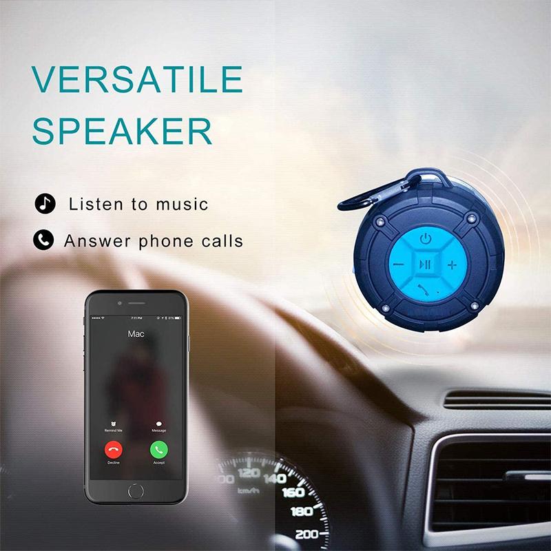 *Large compatibility range*You can play any media player device that supports Bluetooth standard (such as iPhone, smart phone, iPad, tablet, Android, MP3, digital media player) Hands-free wireless music streaming.*Waterproof grade: IPX7*With IPX7 grade design, this waterproof speaker can be used as shower radio, waterproof shower speaker, bathtub speaker, swimming pool speaker, floating speaker, beach speaker, etc. It is suitable for all water environments. (Please remember to dry as soon as possible to extend the service life, and soak for no more than 30 minutes.)*Detachable suction cup: Impressive design*With a detachable suction cup, which is most suitable for use on smooth glass surfaces, the speaker with it's lightweight and compact size increases mobility and applicability. It's suitable for daily indoor and outdoor use , Such as showers, beaches, swimming pools, cars, offices, travel, etc.*Stable Bluetooth connection*Using the upgraded Bluetooth 5.0, within 33 feet, it has a stable signal and high transmission rate to ensure its reliability. The Bluetooth shower speaker supports hands-free calling and has a strong anti-interference ability.*Specifications** *Material:* plastic, silicone* *Size:* 3.5×3.2×2inch* *Product weight:* 125 grams* *Function:* Mini speaker* \* *Use time:* Play time: about 2–3 hours* *Charging time:* about 2–3 hours* *Battery information:* 3.7V/ 500mAh lithium battery* *Operating distance:* up to 10 meters