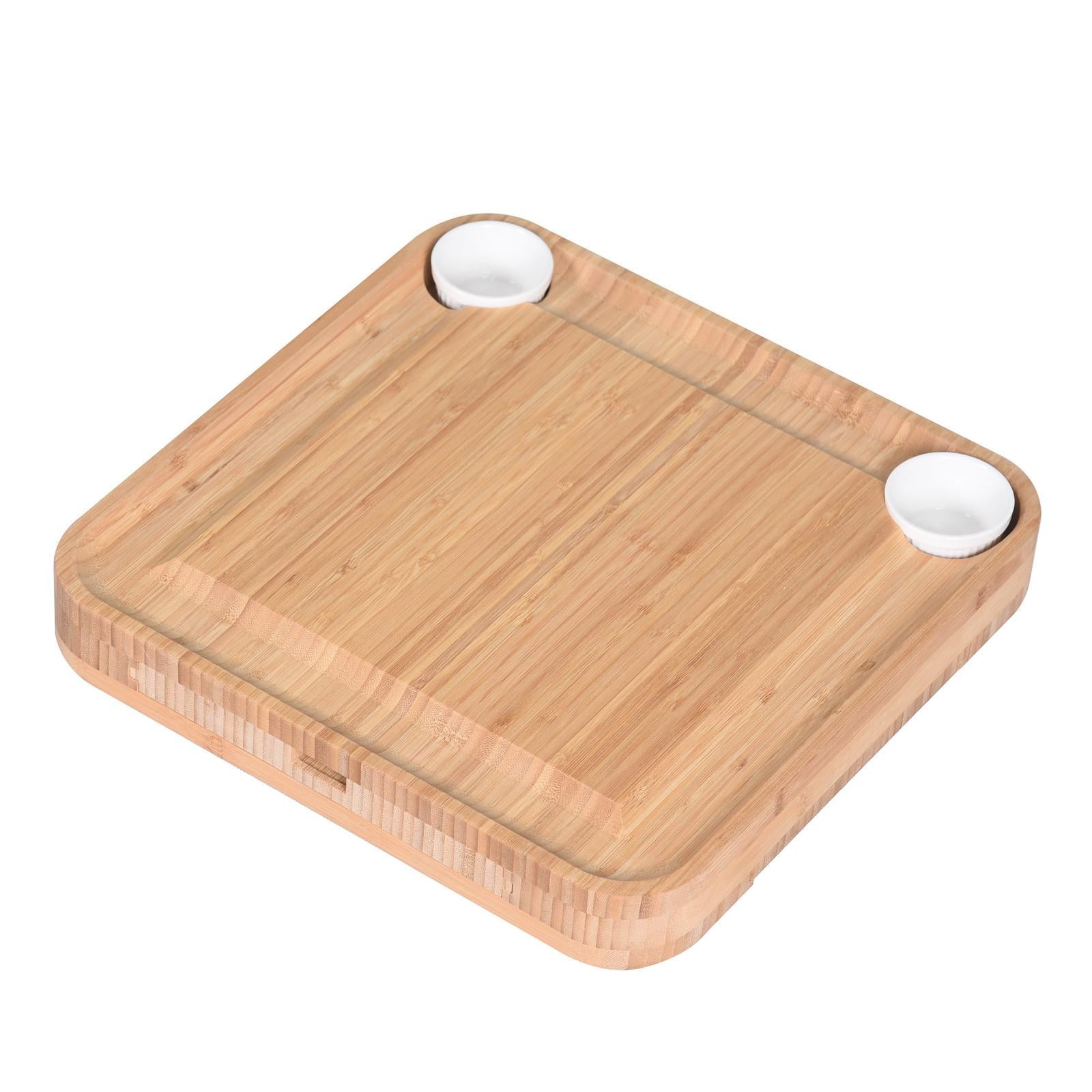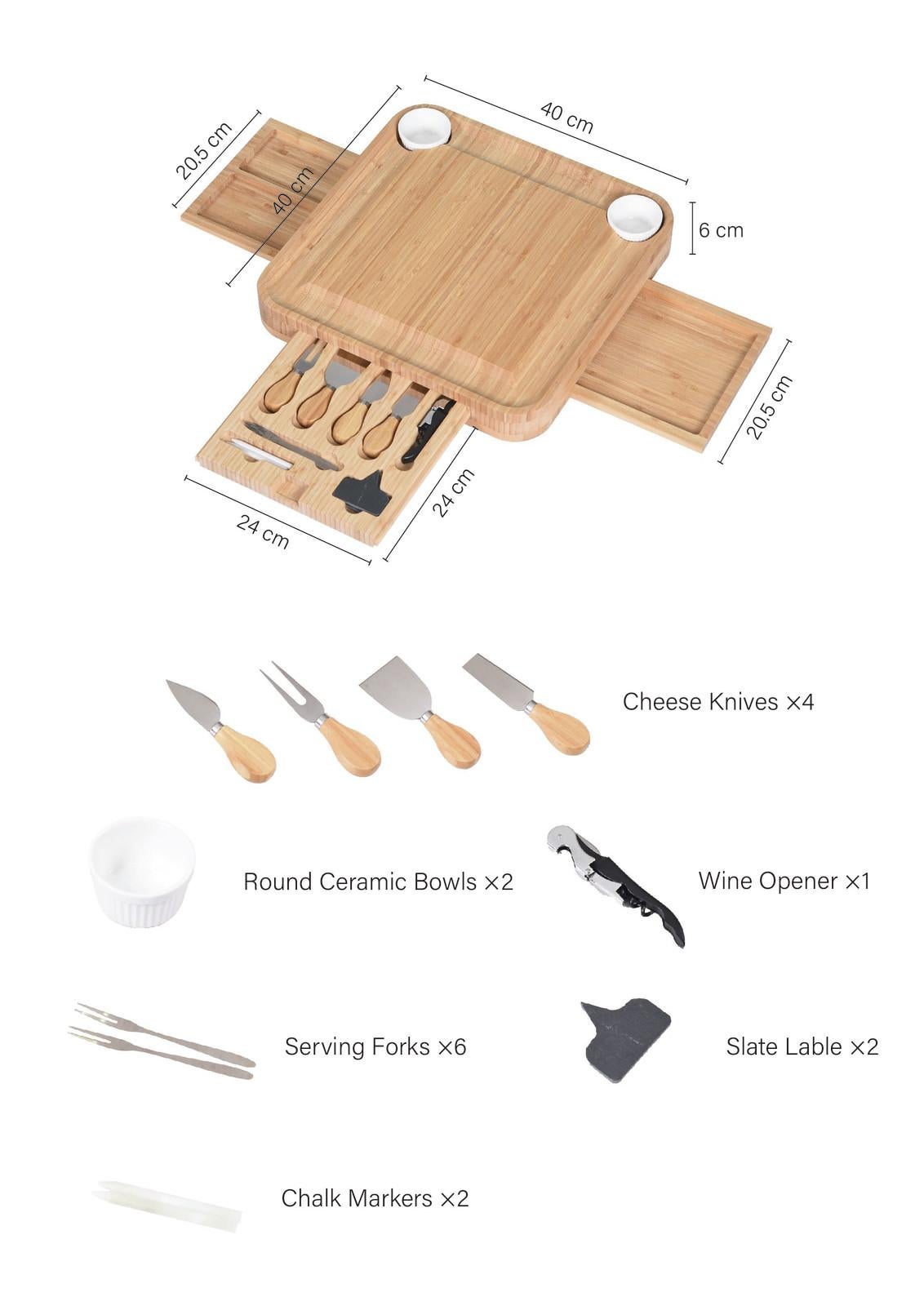 *Bamboo Cheese board set*Surprise your friends and family with the Cheese Board and Knife Set and give them an elegant way to enjoy their favorite cheeses and appetizers. This unique all-inclusive cheese and cutlery set is an amazing housewarming, engagement, wedding, anniversary, retirement, birthday, Christmas, holiday or hostess gift.Enjoy the special touch of hidden drawers inside the large wooden cheese board. It's packed with goodies, including a special wooden cheese knife.Made from eco-friendly bamboo, sustainably grown and 100% natural.Consisting Of , 2 x ceramic bowl , 4 x bamboo cheese knifes ,1 x wine opener , 6× fruit forks, 2 x slate lable , 2 x marker*Features** Fruit forks and one wine opener helps you enjoying picnic or party.* Two markers and natural slate to write on which helps identify the cheese* Two slide drawer save space and removable* Two ceramic bowls and four bamboo knife helps your cheese tasting* Materials made from eco- friendly, sustainably grown and 100% natural* Eco-friendly high quality bamboo, easy to clean and maintain* For extended life of tray use bamboo oil occasionally* Bamboo is easily renewable, so its an environmentally friendly material.* Adds a natural touch to your kitchen*Specifics** Color – Bamboo* Material – Bamboo, Wooden* Product Size 40 × 40 × 6cm