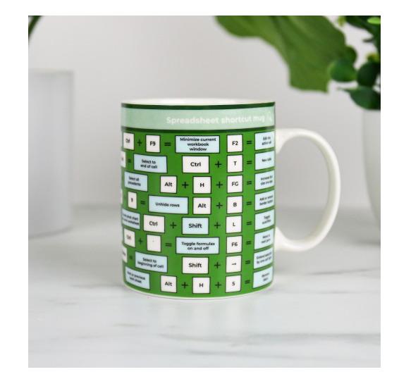 Do you know someone who loves a spreadsheets? Or do you know someone who spends most of their day looking at one but not getting much done? This mug makes the perfect gift, showing some of the most ingenious shortcuts the spreadsheet world has to offer.* DIMENSIONS: 12.5×10.5×9cm* INFO: 350ml / 12oz