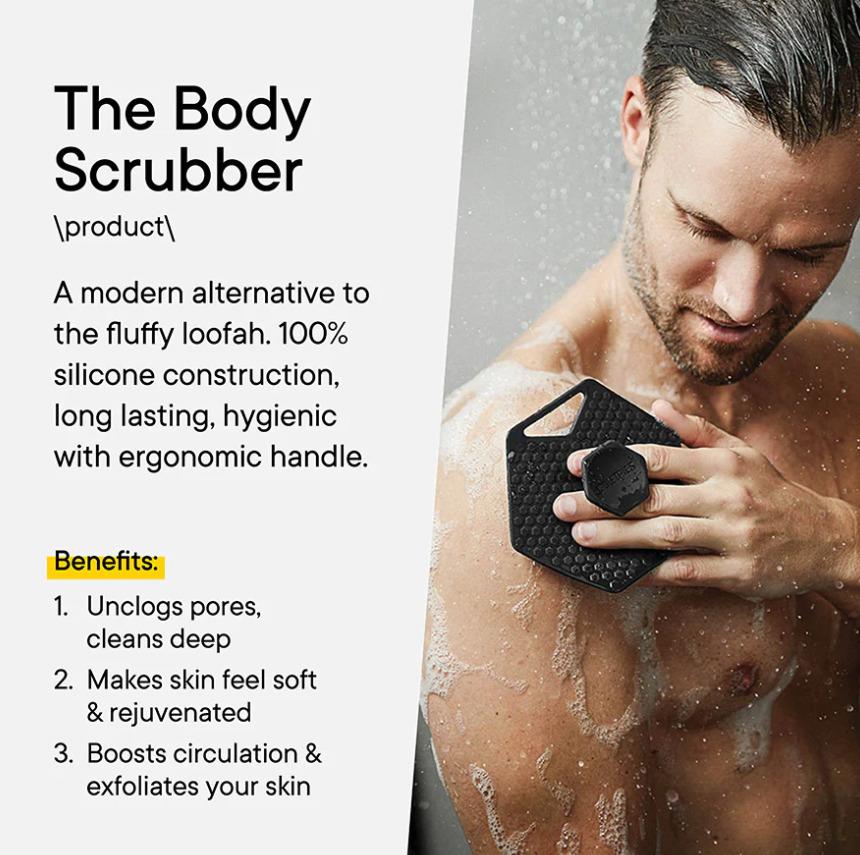 *_Tooletries: The Ultimate Scrubber Set – Charcoal_**The dream team for shower routines*There's nothing quite like a good scrub to get your morning started and this ultimate scrubber set takes exfoliation and hygiene to the next level. The 100% silicone scrubbers helps remove impurities to keep your skin invigorated and clean, while their partners keep your scrubbers clean, hygienic and secure when not in use.*Face Scrubber Benefits** Unclogs pores* Removes dead skin and dry skin* Gets rid of ‘beardruff’* Helps prevent breakouts*Body Scrubber Benefits** Unclogs pores, cleans deep* Makes skin feel soft and rejuvenated* Boosts circulation & exfoliates your skinHow to use:Add your favourite wash directly to the scrubbers and massage onto wet skin.Includes:1 x Body Scrubber & Hook1 x Face Scrubber (Gentle)1 x Ace Holder