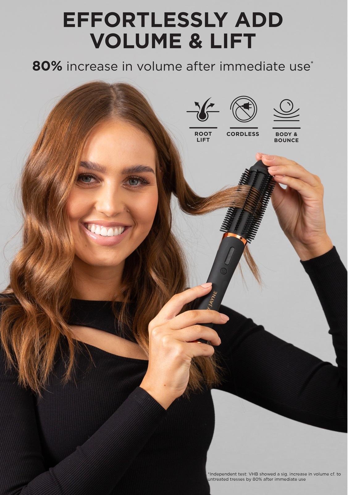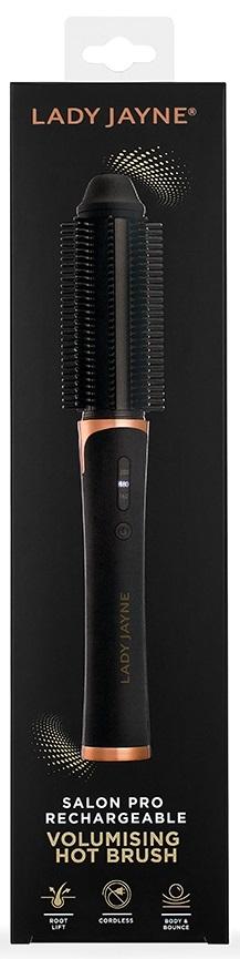 *_Lady Jayne: Pro Rechargeable Volumising Brush_*Effortlessly add volume and lift with the Lady Jayne Salon Pro Rechargeable Volumising Hot Brush. A 27mm ceramic-ionic infused heated radial bristle brush.*Features:** 80% increase in volume\** USB Rechargeable – charge anywhere* 25mins cordless styling time – use anytime* Ceramic-ionic infused 27mm barrel – for smooth shiny hair* Even-heated barrel – for ease of achieving limitless looks* Internal lithium battery – for fast charging (2.5 hours)* 3× Heat settings – ideal for most hair types*How to Use:*1\. Charge for 2.5–3 hours (2V) with supplied charging cable before first use. The LED red light will turn blue when fully charged.Note: The Volumising Hot Brush cannot be used while charging. When the battery is low the red LED lights will sequentially flash to make you aware the battery is low. Depending on the temperature selection, your remaining usage time will be between 2–6 mins.2\. Ensure hair is clean, dry and knotless with a Lady Jayne detangling brush before styling.3\. Turn Volumising Hot Brush on, by pressing the Power / Temperature Button ( ‘D’ ) for 3 seconds.4\. Use the same button to select the temperature best suited for your hair.5\. Section hair between 4–5cm in width and clip to allow for easy styling.6\. Begin with front sections working your way to the back sections by moderately stretching each section with your free hand while using your dominant hand to place the Volumising Hot Brush pointing upwards at an angle at the root to wrap half of hair section around the barrel for 6–8 secs.7\. Brush SLOWLY to naturally unravel section and brush until end of section is reached.8\. To create lift at the crown, place the Volumising Hot Brush at the root horizontally and wrap hair around the barrel and hold for 6–8 secs then unwind.9\. For a more textured natural look, alternate your styling direction with each section.10\. After use, turn your Volumising Hot Brush off by pressing the Power button.11\. After every brush, for next-use convenience, insert charging cable. Once LED lights have turned white remove charging cord.12\. Allow Volumising Hot Brush to cool before storing in velvet pouch provided.